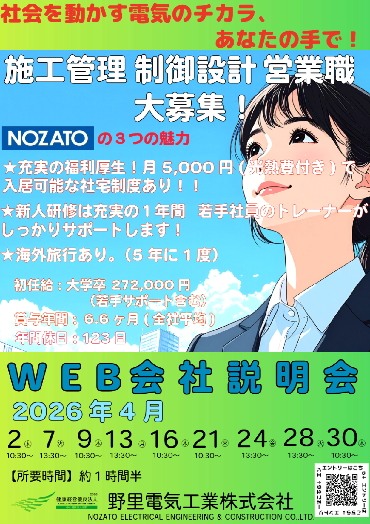Recruit News 採用ニュース 2026 4.1 【27卒採用】4月度WEB会社説明会のご案内 4月度WEB会社説明会をご案内致します。 採用ページよりエントリーお待ちしております! 前の記事へ 一覧に戻る Briefing Session Entry 会社説明会エントリー WEBからエントリー エントリーフォーム 電話でエントリー 大阪本社 大阪管理課 : 榊原・片山 06-6477-6004 受付時間 平日 10:00 ~ 17:00 01採用TOP 02野里電気工業の特徴 03働く人のデータ 04仕事内容 05福利厚生・制度 06働くスタイル 07社員のホンネ 08採用Q & A 09募集要項(新卒) 10募集要項(キャリア)